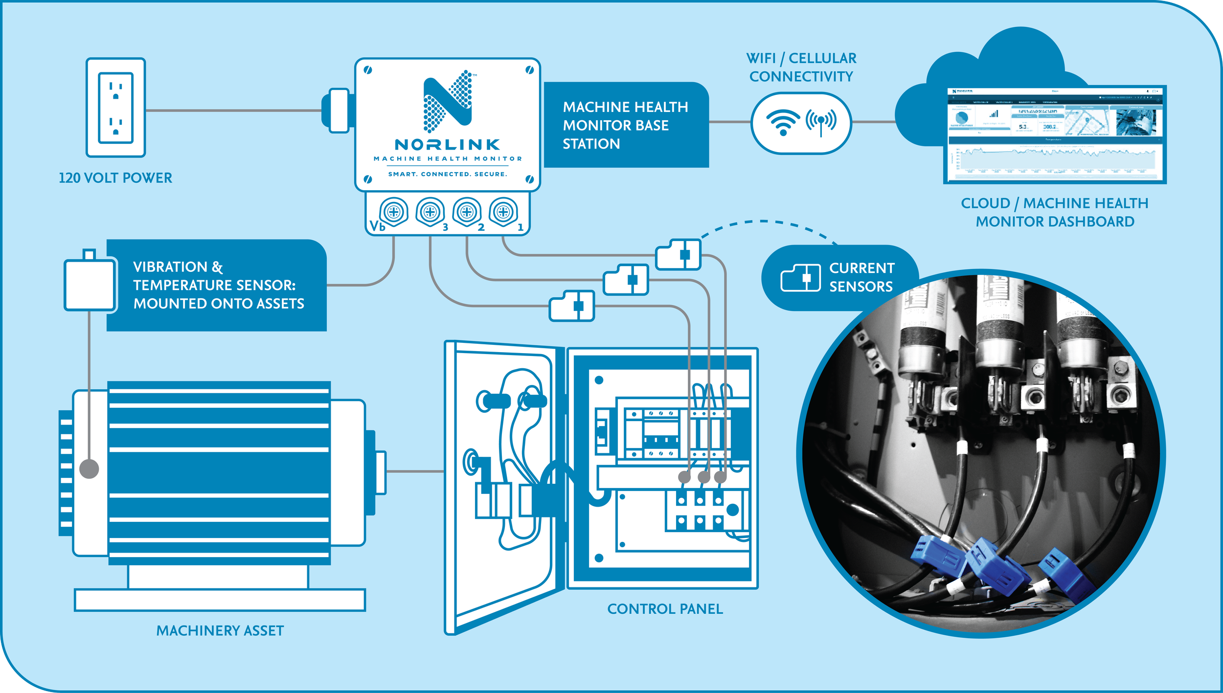 Installing the Machine Health Monitor is fast, clean, and completely non-invasive. The compact base station mounts neatly near your existing control panel and plugs right into standard 120V power. From there, clamp-on current sensors snap securely around each motor lead — no cutting, splicing, or landing wires required. The vibration and temperature sensors attach directly to your assets using an industrial adhesive or strong magnet, making placement simple and allowing for temporary or trial installs when needed. Once powered, the system automatically streams data over Wi-Fi or cellular to the cloud dashboard and starts building insight right away with a professional install that takes minutes, not hours.